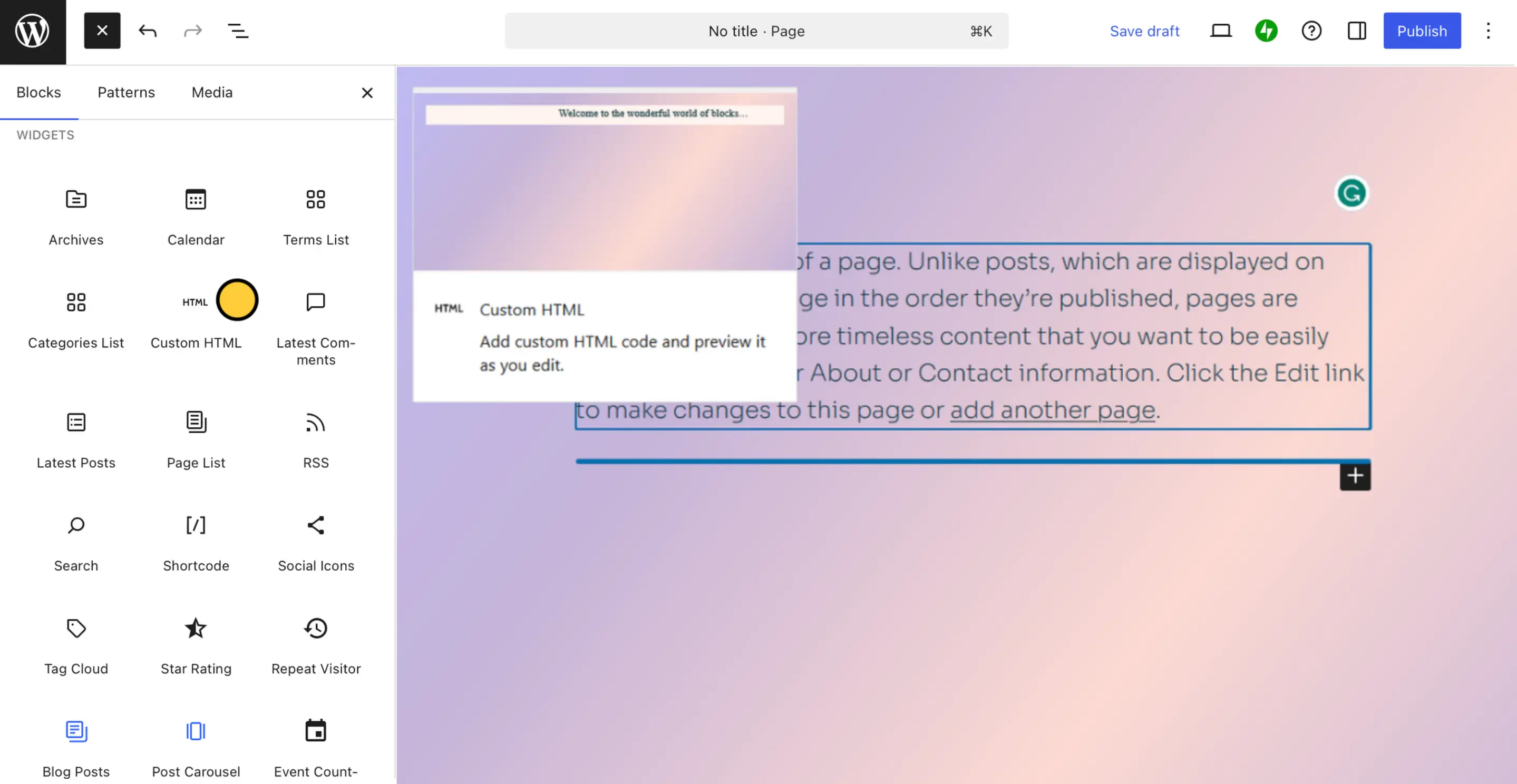 + in the upper left corner of the page editor to open the Block Inserter in the left side (or press Ctrl + Alt + Y to insert a block below your cursor’s current position) and search for the Custom HTML block.