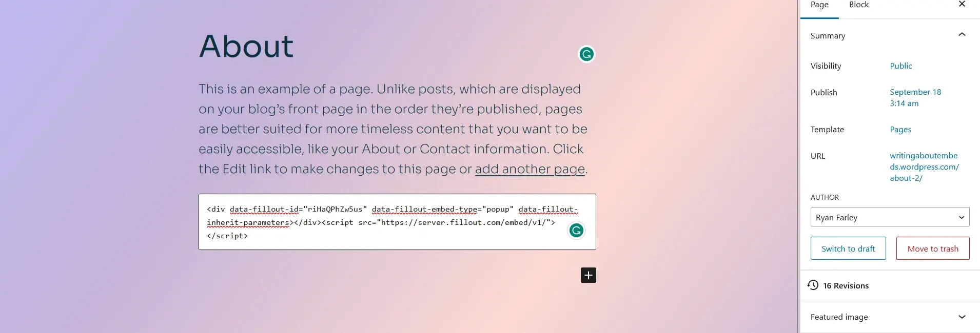 - Add a Fillout embed code to a Custom HTML block using the Visual editor