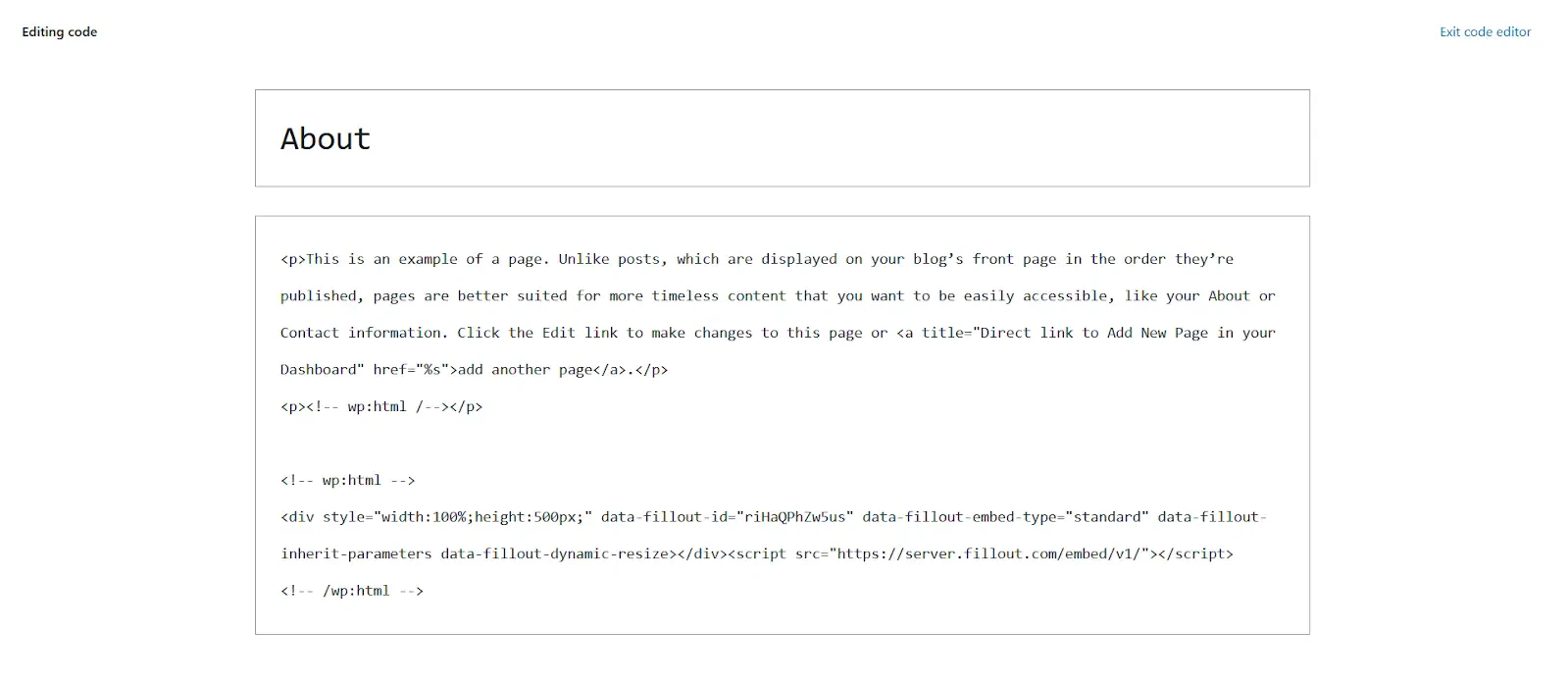 - Add a Fillout embed code to your page’s HTML code using the Code editor